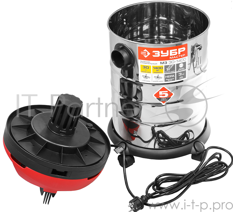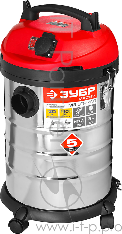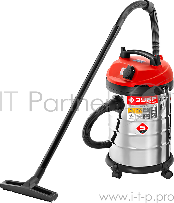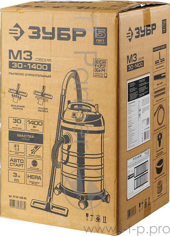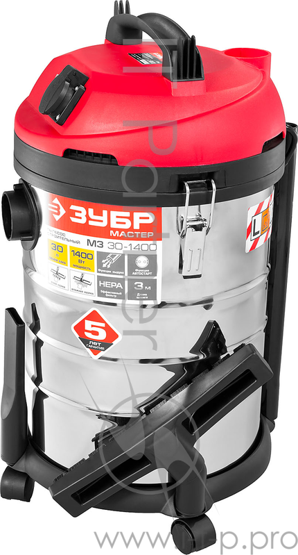 Электроинструменты ЗУБР Пылесос строительный ПУ-30-1400 М3 { М3-30, 30 л, 1400 Вт, сухая и влажная уборка, корпус из нержавеющей стали, розетка до 2000Вт }