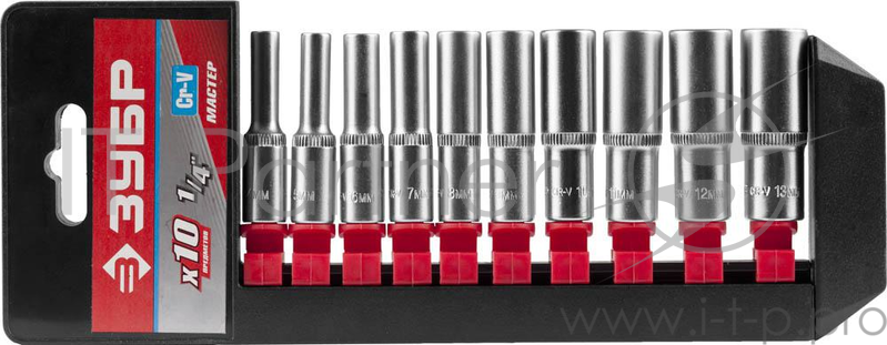 Наборы Набор ЗУБР "МАСТЕР": Торцовые головки (1/4") удлиненные на пластиковом рельсе, Cr-V, 4-13мм, 10 предметов 27657-H10