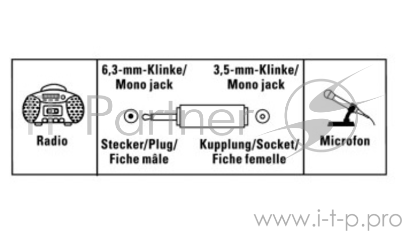 Описание: Монофонический переходник для подключения микрофонов с разъемом Jack 3.5 к стандартным разъемам Jack 6.3 на усилителях или караоке системах.