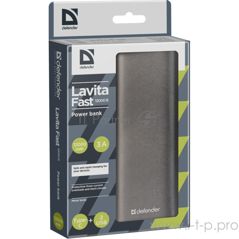 Внешний аккумулятор Defender Lavita Fast 12000B 2*USB+1*Type-C, 12000 mAh, 3A (83626)