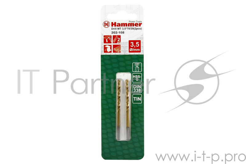 Сверло Hammer Flex 202-108 DR MT 3,5мм*70/39мм (2pcs) металл, DIN338, HSS-G, TIN, 2шт. [30793]