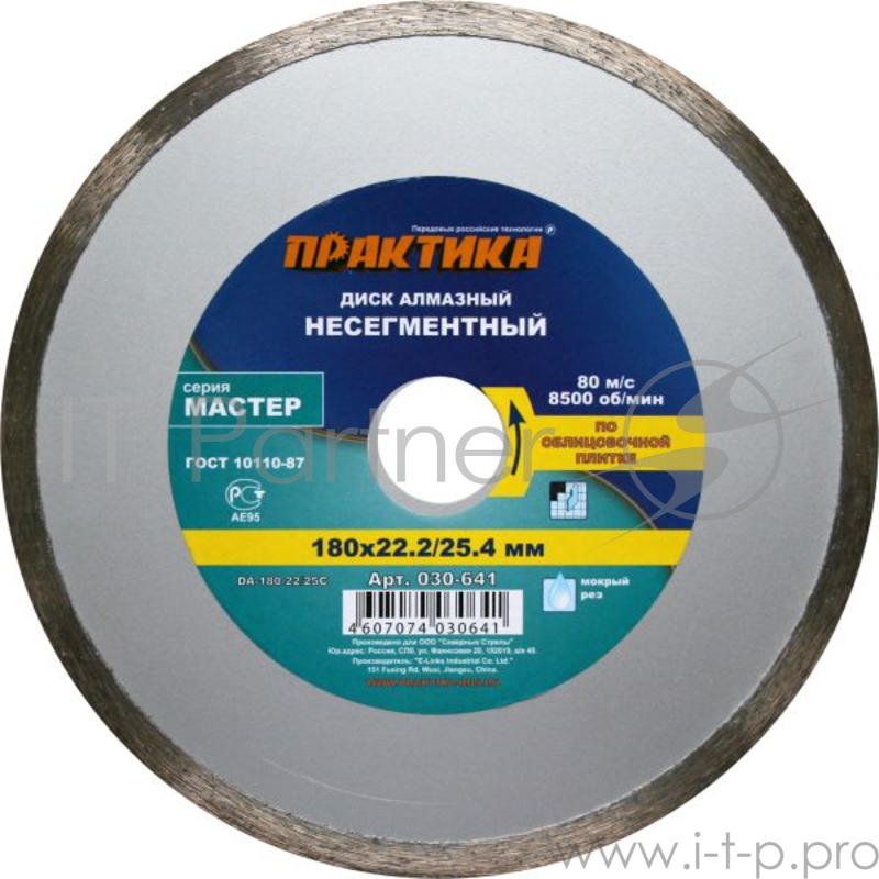 Диски отрезные, пильные, шлифовальные Диск алмазный несегментный ПРАКТИКА 180х22 / 25,4 Мастер [030-641]