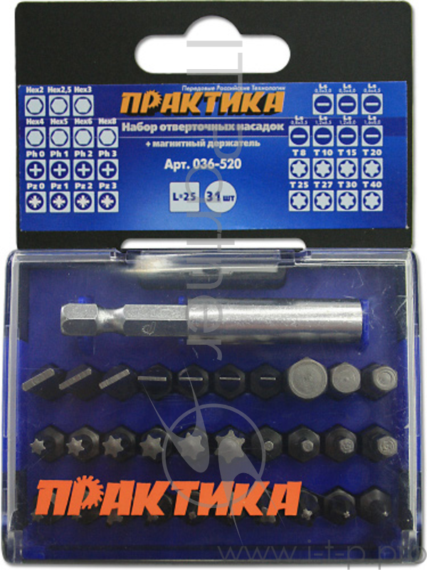 Набор бит ПРАКТИКА 036-520 31шт.: Ph 4шт, Pz 4шт, Sl 7шт., Torx 8шт., Hex 7шт., держатель