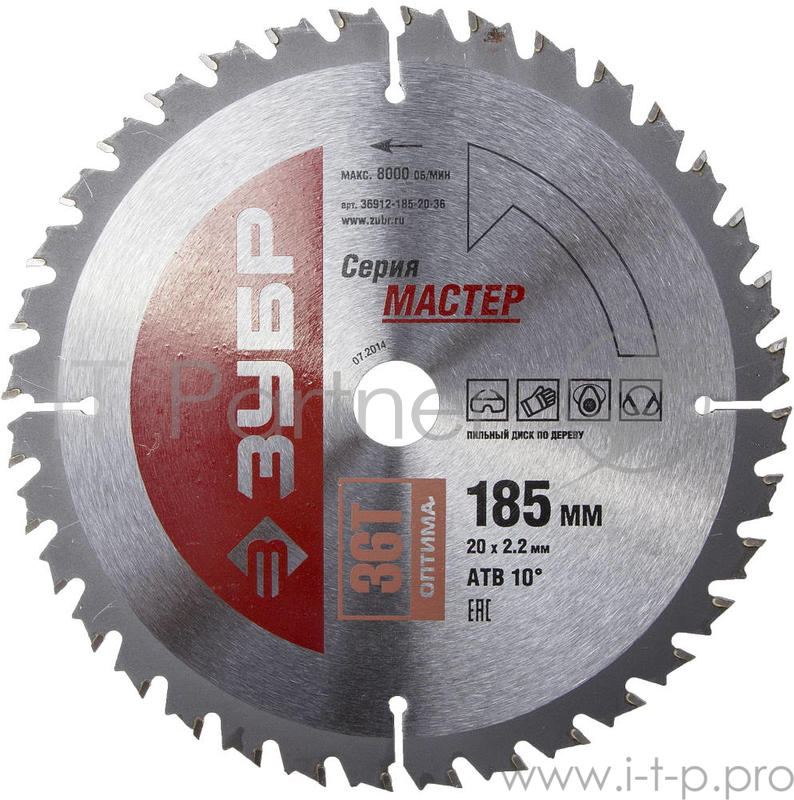 Круг пильный твердосплавный ЗУБР 36912-185-20-36 МАСТЕР оптимальный рез по дереву 185x20 36T