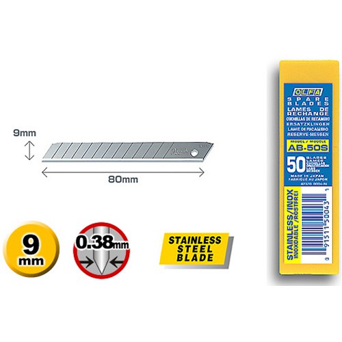 Штукатурно -малярный инструмент Лезвия OLFA (OL-AB-50S) сегментированные из нержавеющей стали, 9х80х0,38мм, 13 сегментов, 50шт