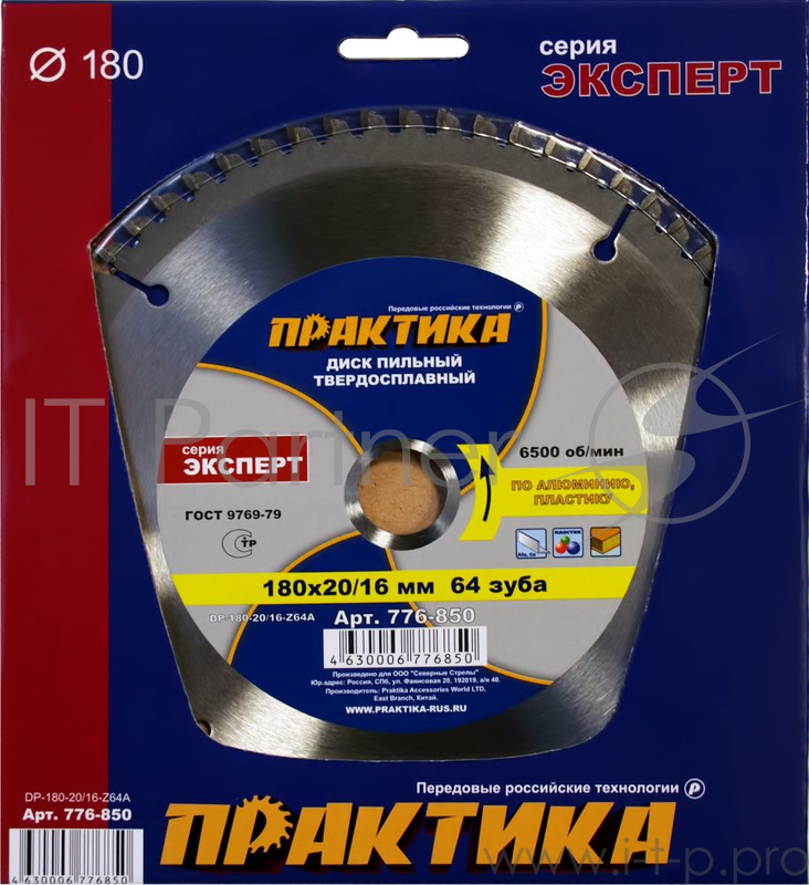 Диск пильный по ламинату ПРАКТИКА 776-850 DP-180-20/16-Z64A 180х64x20/16мм T=1.8мм, по алюм., лам.