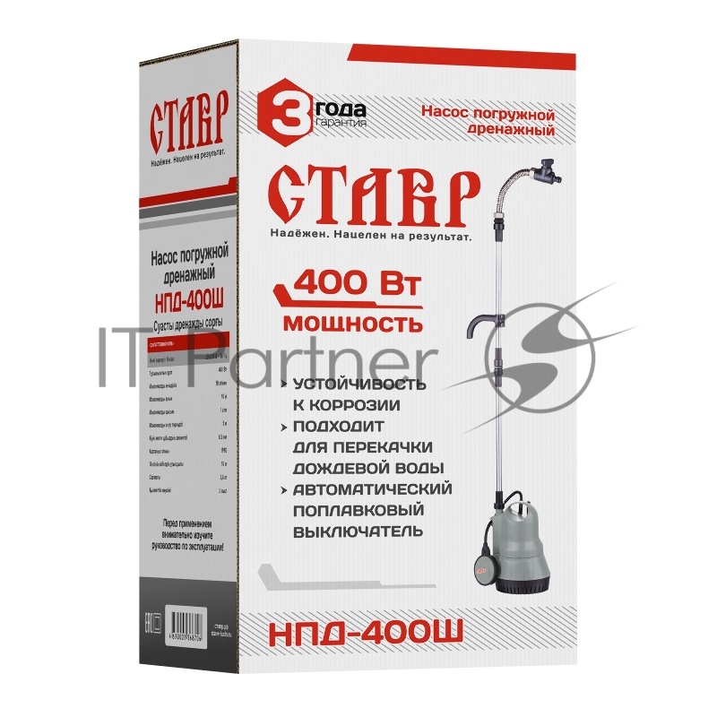 Ставр НПД-400Ш (4шт) Насос погружной дренажный 400Вт, максимальная производительность 50л/мин, напор 10м, максимальная глубина погружения 5м, макс размер пропускаемых частиц 0,5мм, диаметр выходного патрубка 3/4 дюйма, длина кабеля 10 м, штанга с к
