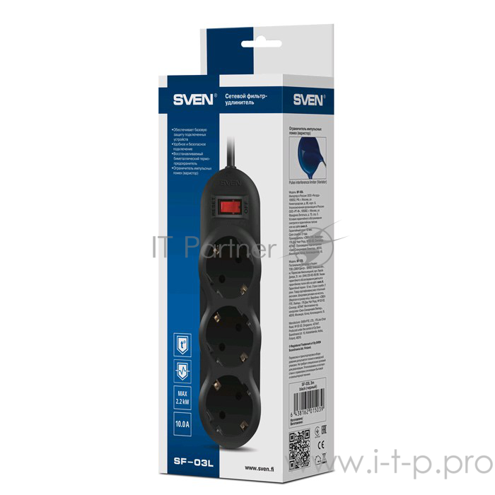 Сетевые фильтры SVEN Фильтр SF-03L 3.0 м (3 евророзетки), черный SV-015039