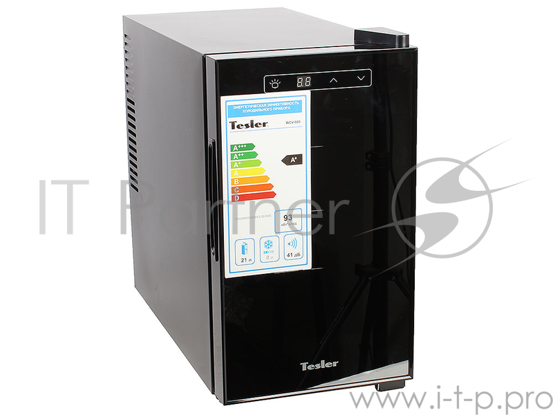 Винный шкаф TESLER WCV-080 21л винный шкаф (ШхГхВ) 25,4x51,4x46,3см. Общий объем 21л. Макс. кол-во бутылок 8шт. Температурный режим 7-18°C. Класс энергопотребления А+. Количество зон 1. Тип управления электронный. Тип системы охлаждения термоэлектрич