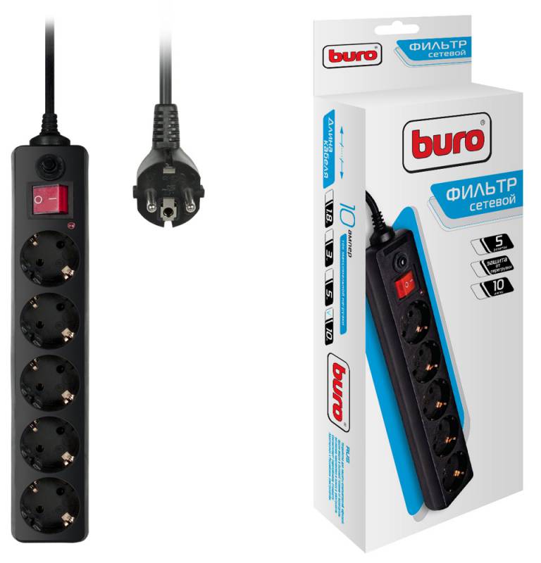 Сетевые фильтры BURO Сетевой фильтр, 5 розеток, 10 метров, (500SH-10-B), черный (коробка) {992303}