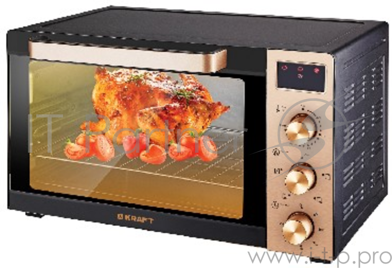 Мини-печь KRAFT KF-MO 3507 KGL (золотой) с дисплеем + чаша в Габаритные размеры в упаковке (ШxВxГ) 52,5х47,5х34,5 см. Объем 35л. Мощность 1500 Вт. Максимальная температура 230 (°С). Таймер отключения 120 (мин). Кол-во режимов работы 4. Внутре