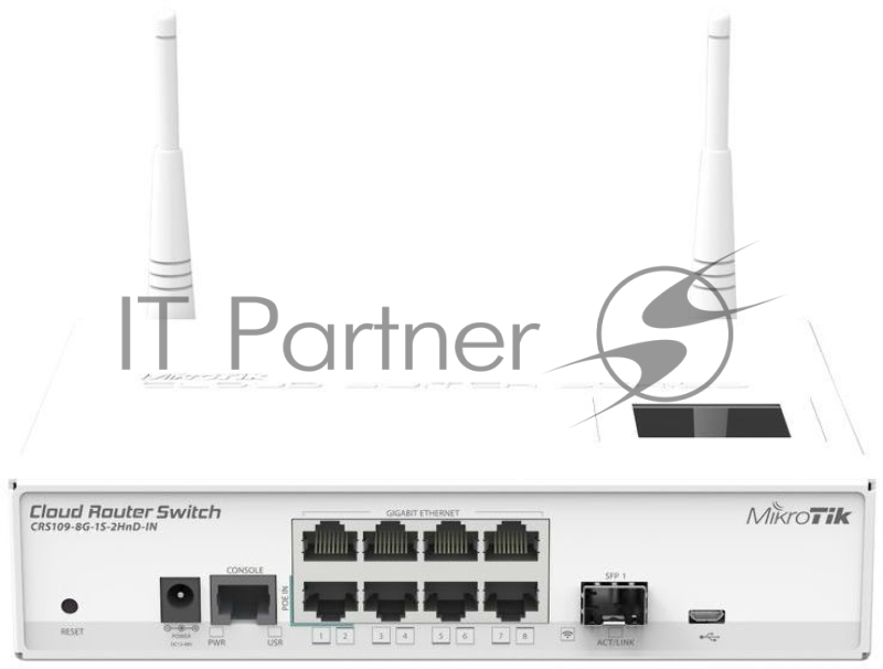 Сетевое оборудование MikroTik CRS109-8G-1S-2HnD-IN Коммутатор Cloud Router Switch 8x Gigabit Smart Switch, 1x SFP cage, LCD, 1000mW 802.11b/g/n Dual Chain wireless, 600MHz CPU, 128MB RAM