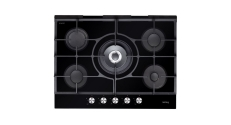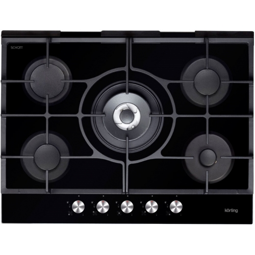 Встраиваемые газовые панели Korting Crystal, 72x50 см, газовая, стеклокерамика, независимая, 5 конфорок, электроподжиг, газ-контроль, чугунные решетки, в комплекте - подставка WOK и адаптер для кофейника, черная