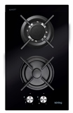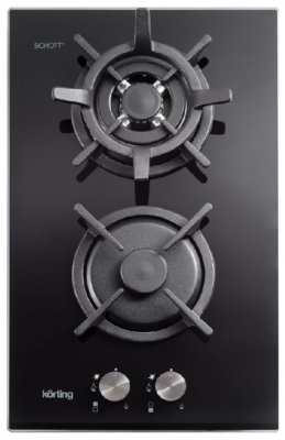 Домино Korting Crystal, 30 x 51 см, газовая, стеклокерамика, 2 конфорки, электроподжиг, газ-контроль, чугунные решетки, в комплекте - подставка WOK и адаптер для кофейника, черная