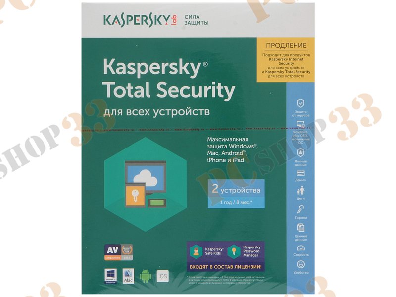 Программа для комплексной защиты Kaspersky Total Security для всех устройств, 2 устр. на 8 мес. или продление на 1 год, рус. (Box)