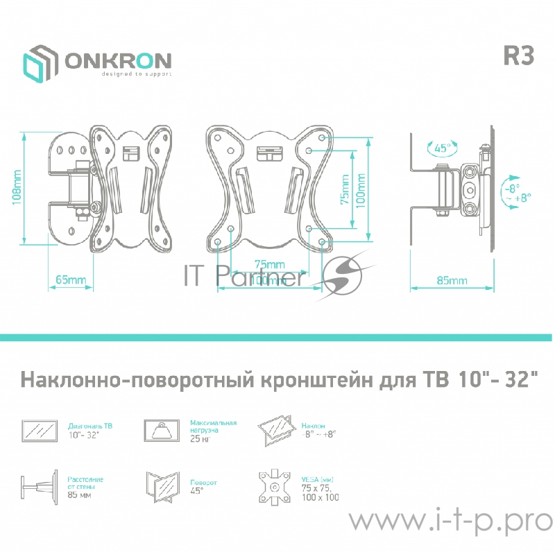 Кронштейн ONKRON Кронштейн ONKRON/ 17-27'' макс 100*100 мм, наклон -+ 8?, поворот: 45°, от стены 85 мм, макс вес 25кг, черный