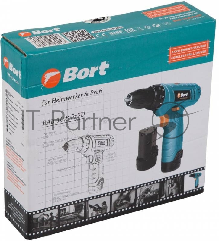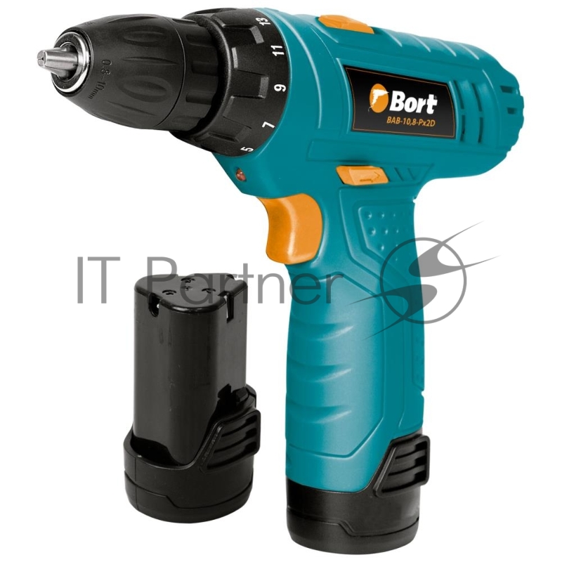 Дрели, Шуруповерты, Гайковерты, Миксеры Bort BAB-10,8-Px2D Дрель-шуруповерт аккумуляторная 91270948 { 10,8 В, 1.3 Ач, Li-lon, 2 Акк, 23 Нм, 350 об/мин, БЗП, 0,8 кг, коробка, набор аксессуаров 2 шт }