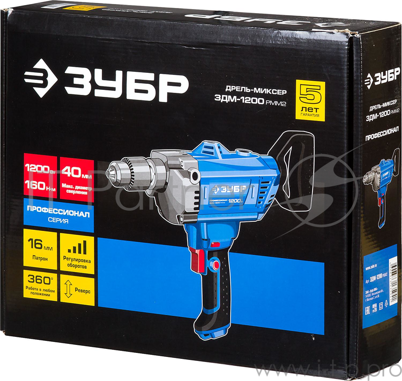 Дрель, Шуруповерт ЗУБР "ПРОФЕССИОНАЛ" ЗДМ-1200 РММ2 Дрель-миксер ЗДМ-1200 РММ2 { реверсивная, патрон 16мм, 0-850об/мин, 1200Вт }