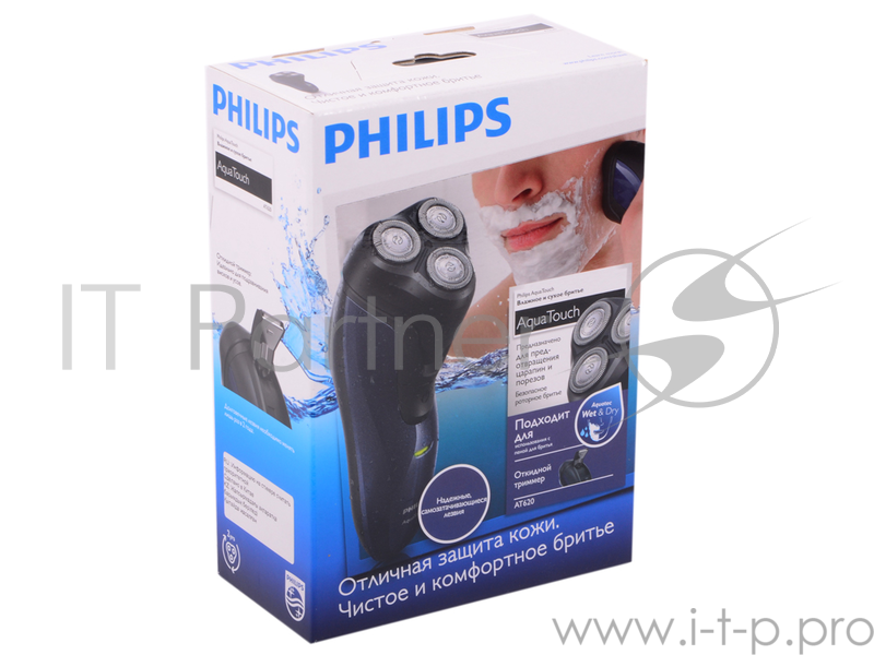 Бритва Philips AT620/14 электрическая AquaTouch, 100% водостойкая, функция Aquatec – просто выбирайте между сухим и влажным бритьем (с пеной или гелем), режущая система CloseCut, откидной триммер, работа от аккумулятора 30 минут. Цвет черный с сини