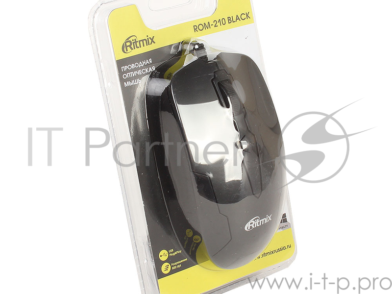 Мыши RITMIX ROM-210 Black USB {Проводн., 800 DPI, 2+1 кнопок, 150 см провод, блистер}