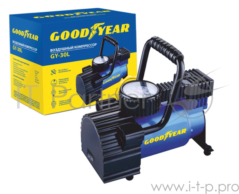 Компрессор GOODYEAR GY000101 GY-30L 30 л/мин Мощность 156 Вт, Производительность 30 л/мин, Максимальное токопотребление 13 А, Максимальное давление - 7 Атм, Длина провода питания: 3 м, Длина воздушного шланга: 1 м. Сумка и набор переходников в компле