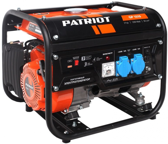 Генератор бензиновый PATRIOT GP 1510 [474101525] {Двигатель: 4т, OHV, АИ-92, 94 сс, 3.0 л.сМощность ном/макс: 1.0/1.2 кВт Объём бака: 6 л Розетки: 2 евро 16А Вес: 23 кг}