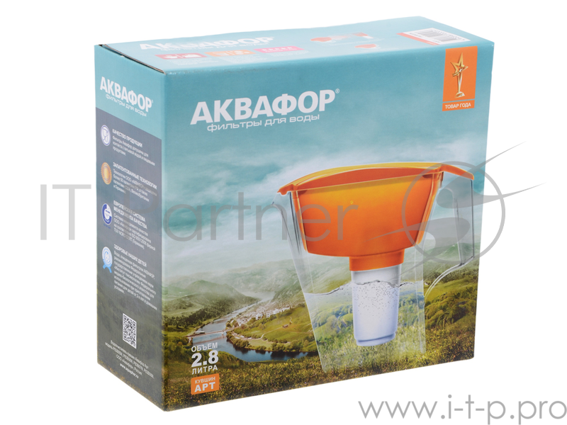 Фильтр для воды Аквафор АРТ (с В100-5)(оранжевый) (объём кувшина / воронки: 2,8 / 1,4 л.Крышка: сплошная. Ресурс: 300 л. Скорость фильтрации: 3-10 мин. на воронку. Активный хлор: 100%, нефтепродукты (бензол): 95%, тяжелые металлы: 99%. Арт использует