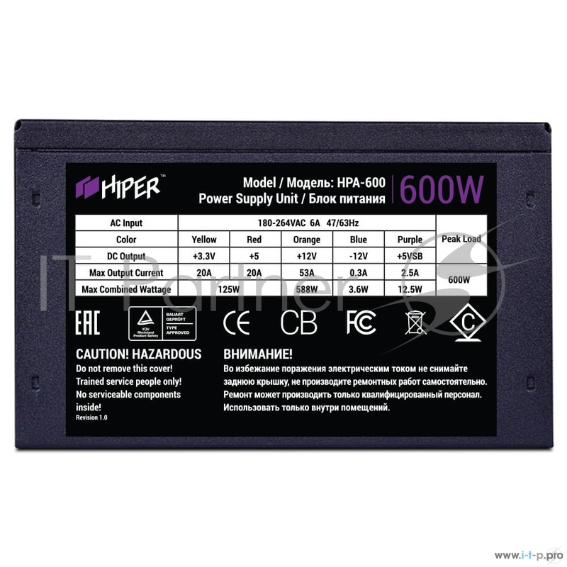 Блок питания HIPER HPA-600 (ATX 2.31, 600W, Active PFC, 80Plus, 120mm fan, черный) BOX