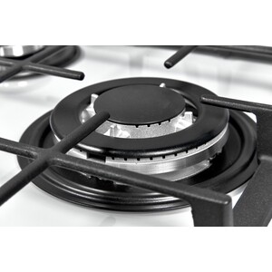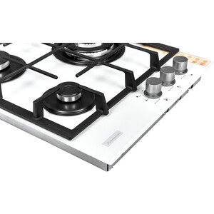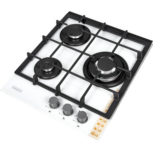 Встраиваемые газовые панели Газ, Газовая варочная поверхность, Закаленное стекло, Ширина 45 см , 3 газовые конфорки, WOK конфорка, Автоподжиг, Газ-контроль, Чугунная решетка, Жиклёры для баллонного газа, ручки цвета нержавеющая сталь, Цвет:белый