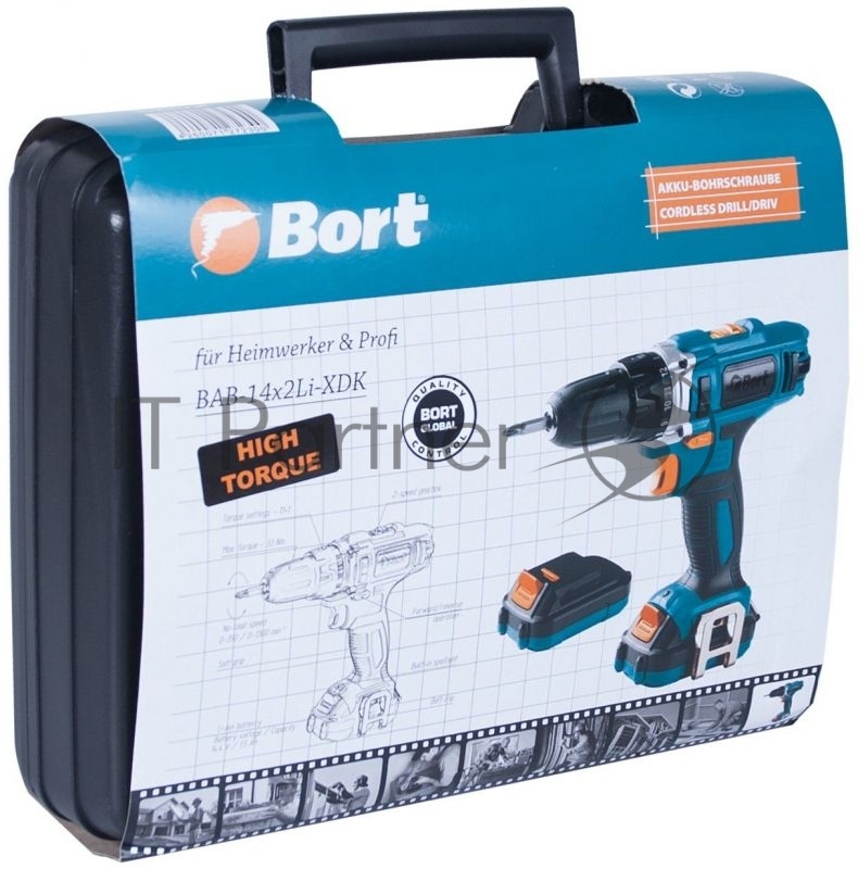 Дрели, Шуруповерты, Гайковерты, Миксеры Bort BAB-14x2Li-XDK Дрель-шуруповерт аккумуляторная 91272300 { 14,4 В, 1.5 Ач, Li-Ion, 2 Акк, 33 Нм, 1300 об/мин, БЗП, 1,5 кг, кейс, набор аксессуаров 3 шт }