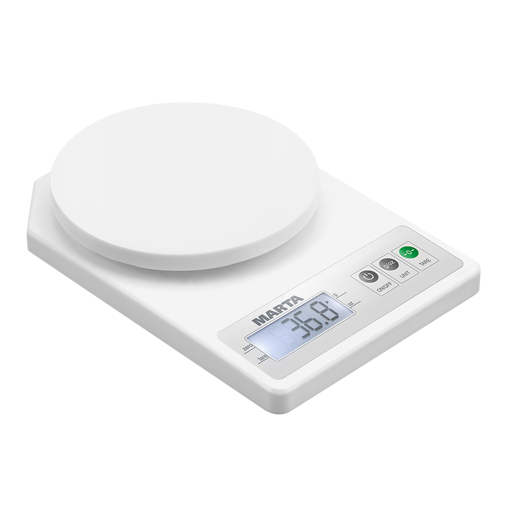 Весы кухонные электронные MARTA MT-1637 белый жемчуг Макс.вес 5 кг. Цена деления: 1 г. LCD Дисплей с подсветкой, Функция ""Тара"", Индикатор перегрузки, замены батареи. Авто отключение. Ед.измерения г/унция. 2 батареи 1,5 V типа AAA (в комплекте), 20