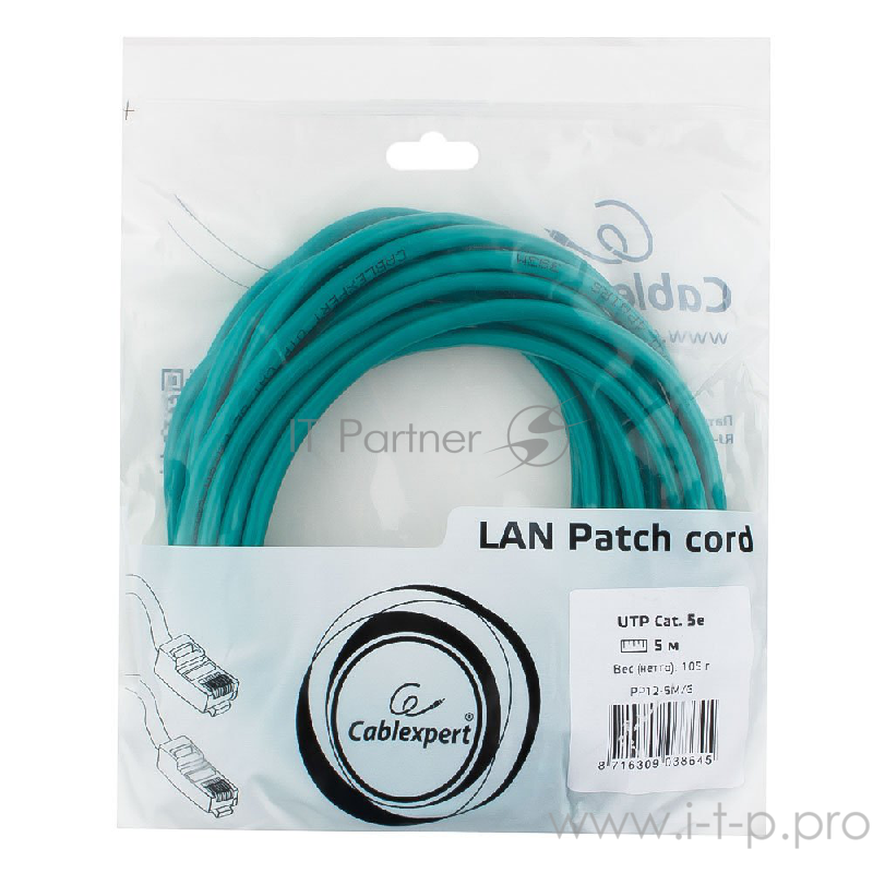 Патч-корд UTP Gembird кат.5e, 5м, литой, многожильный (зеленый)
