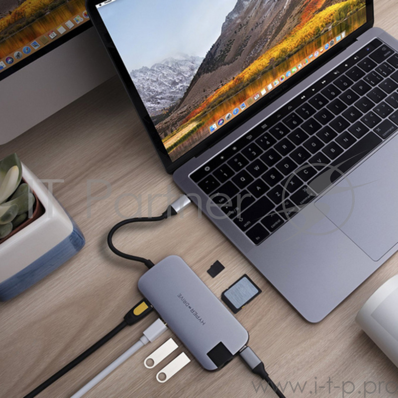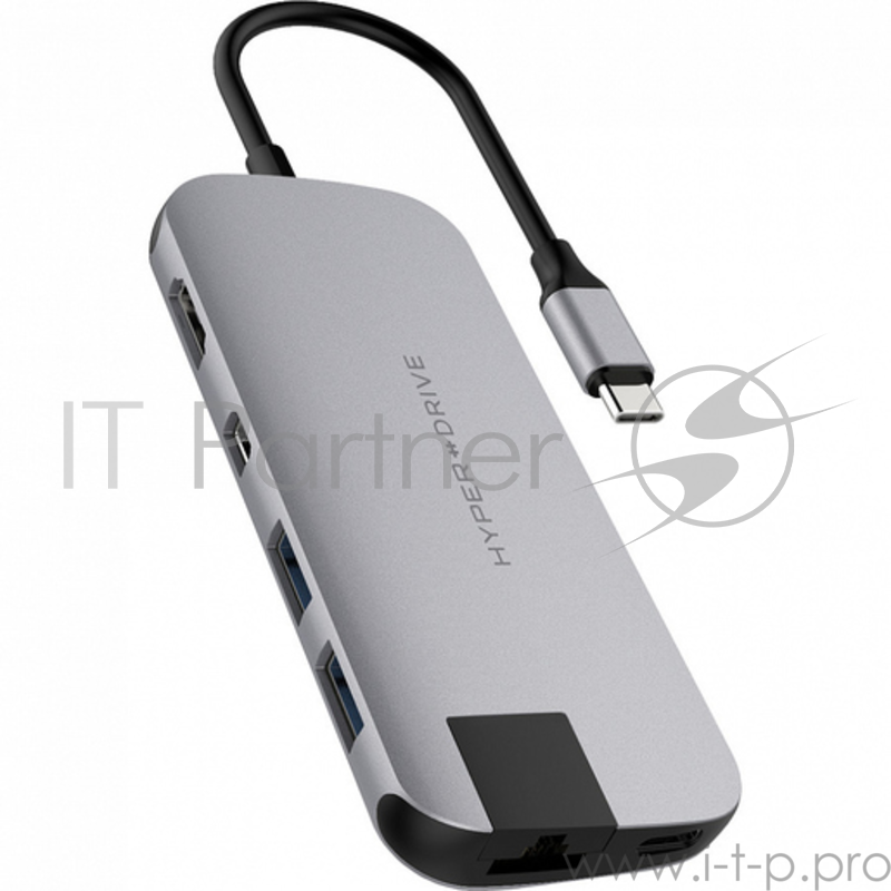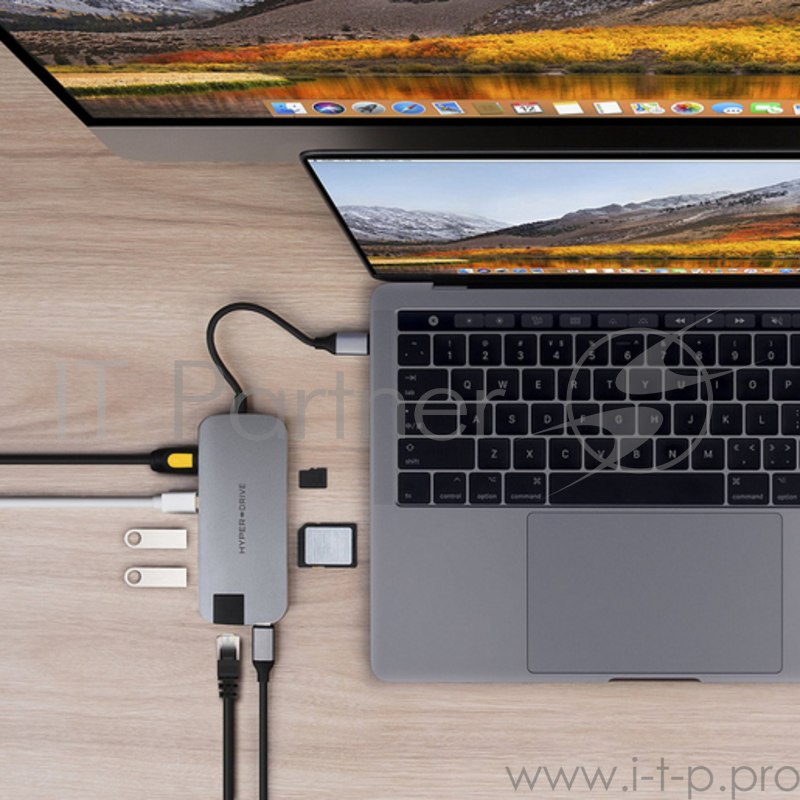 USB-хаб Hyper HyperDrive SLIM 8-in-1 Hub для Macbook и других устройств с портом Type-C. Порты: 4K/30Hz HDMI, USB-C Power Delivery, 2 x USB-A, Micro SD, SD, Gigabit Ethernet, Mini DisplayPort. Цвет серый космос.