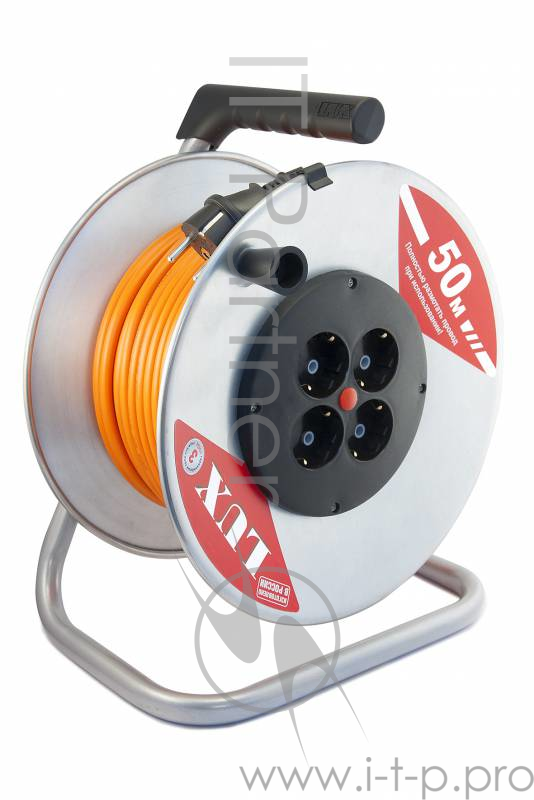 Удлинитель силовой LUX 40150 К4-Е-50 ПВС 3x1.5 50м 16А 4розетки с з/к на металл. катушке