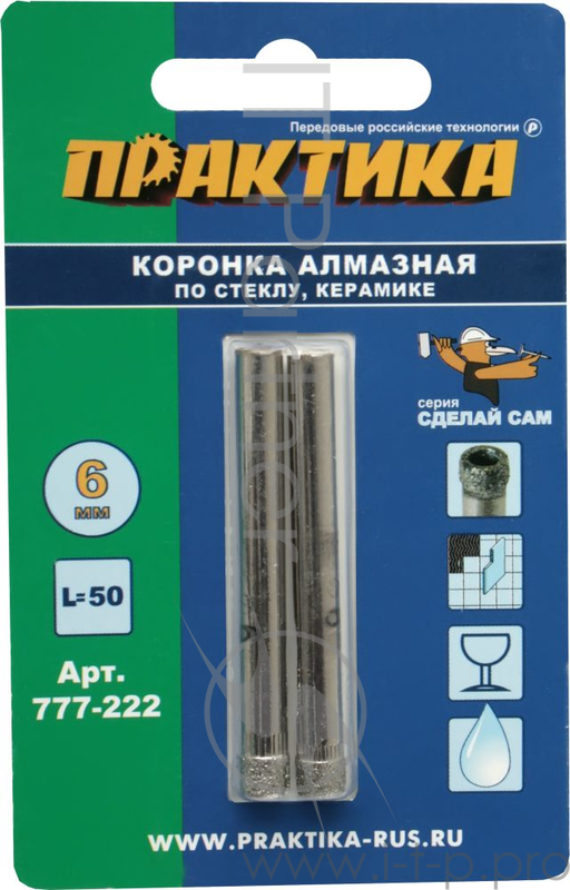 Сверла,коронки,наборы Сверло алмазное по стеклу керамике ПРАКТИКА 6мм 2шт блистер 777-222