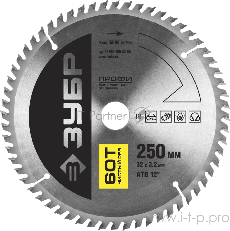 Круг пильный твердосплавный ЗУБР 36852-250-32-60 ПРОФИ чистый рез по дереву 60T 250х32мм