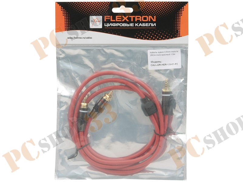 Кабель-переходник аудио 3.5мм стерео->2xRCA Flextron CAU-J2R-HER-1.5-01-P2, позолоченные контакты (1.5м), красный