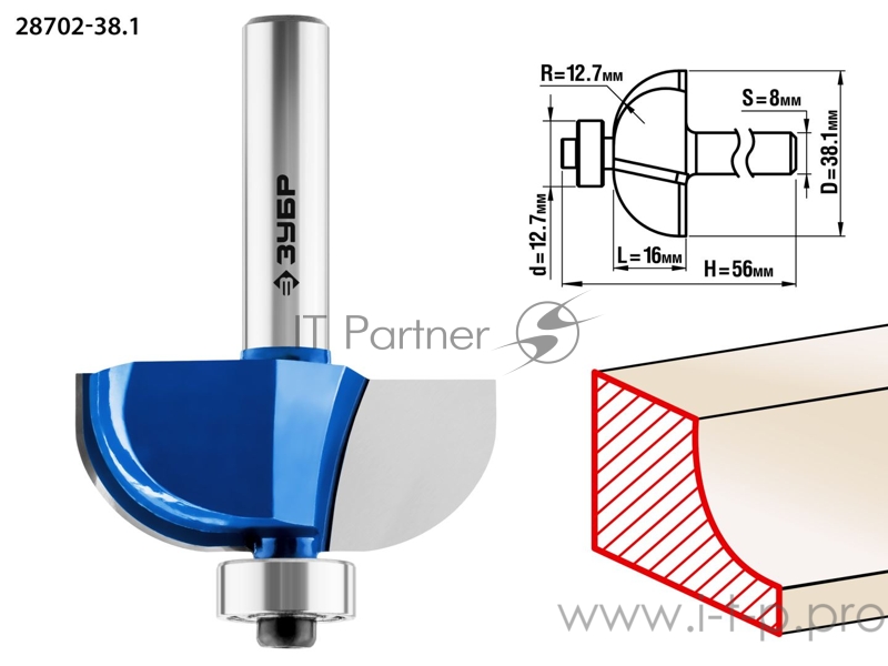 Фреза ЗУБР 28702-38.1 кромочная калевочная №2 d= 38.1мм дл.-16мм рад.-12.7мм хв.-8мм d-12.7мм