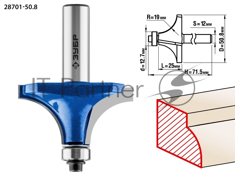 Фреза ЗУБР 28701-50.8 кромочная калевочная №1 d= 50.8мм дл.-25мм рад.-19мм хв.-12мм d-12.7мм