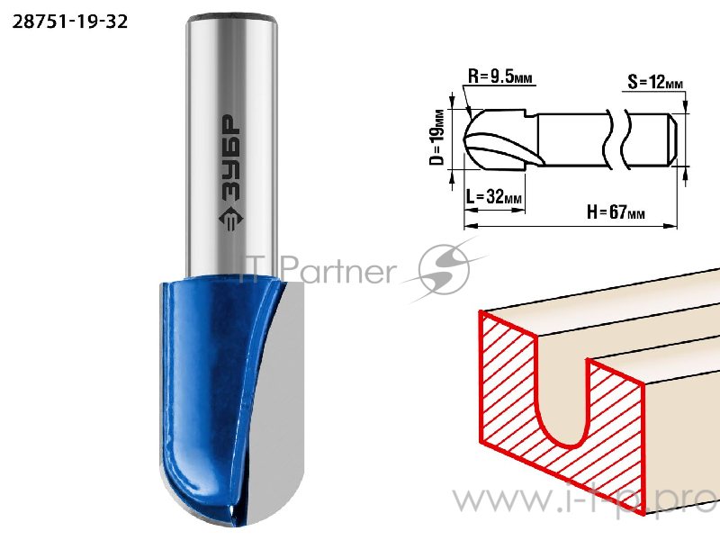 Фреза ЗУБР 28751-19-32 пазовая галтельная d= 19мм дл.-32мм рад.-9.5мм хв.-12мм