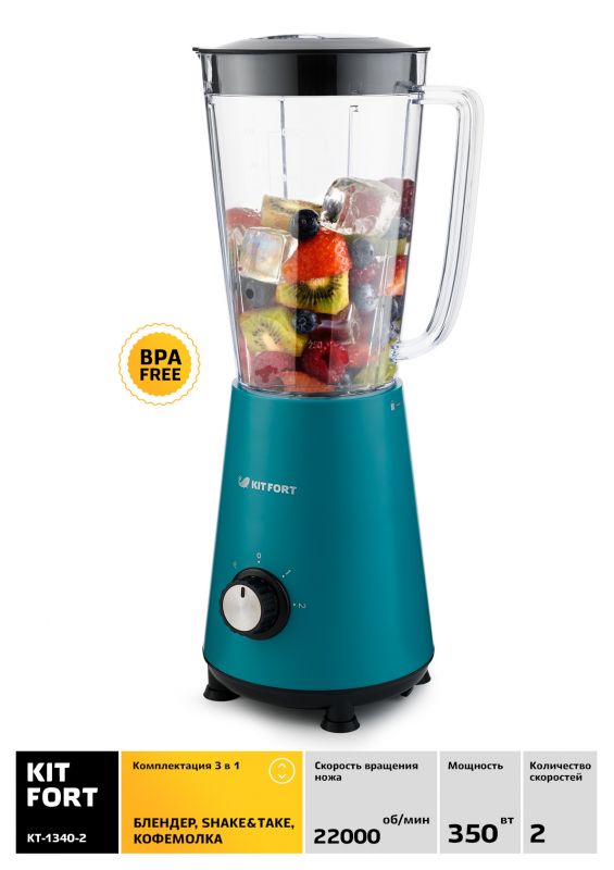 Особенности: Блендер Kitfort КТ-1340 сочетает в себе функции трех устройств. Это стационарный блендер с функцией Shake & Take (шейк энд тэйк) и портативными бутылками, а