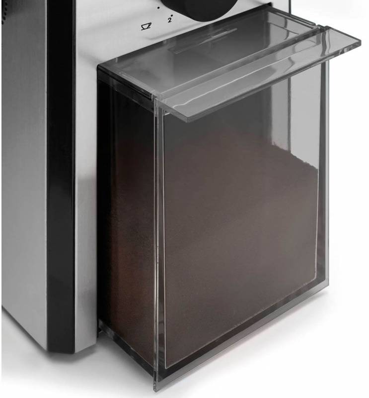 Особенности: Вместимость: 12 чашек. Благодаря двум ненагревающимся жерновам кофе сохраняет аромат, а разбирающаяся конструкция упрощает процесс очистки. Регулировка степени помола от мелкого до крупного. Двойная система защиты от случайного включения. После помола, кофемолка останавливается автоматически.