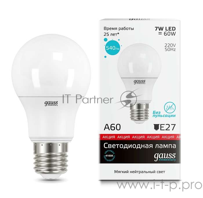 GAUSS 23227A Светодиодная лампа LED Elementary A60 7W E27 540lm 4100K 1/10/100 0