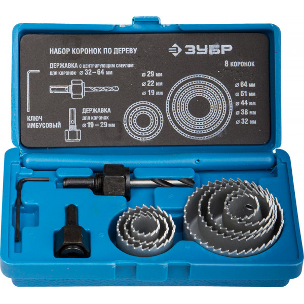 Буры,сверла,долото Набор ЗУБР ЭКСПЕРТ (2955-H11_z01) Коронки по дереву 19-64мм, державка 19-30мм, державка с опорн. основан., ключ имбус. 2,5мм, 11 пред