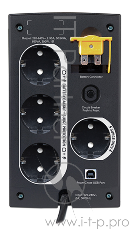 Источник бесперебойного питания для персональных компьютеров APC Back-UPS RS, 650VA/390W, 230V, AVR, 3xSchuko outlets (battery backup), DSL protection, USB, PCh., 2 year warranty