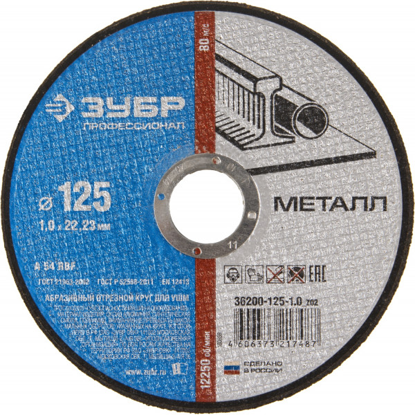 Оснастка Круг отрезной абразивный ЗУБР ПРОФЕССИОНАЛ по металлу, 125ммх1,0ммх22,23мм [36200-125-1.0_z02]