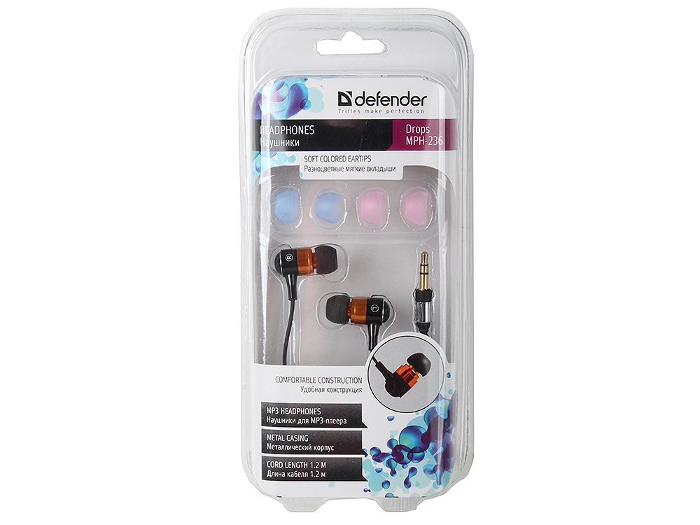 Наушники-вкладыши Defender MPH-236 /для плеера/ 2 пары цветн.вкладышей /?8 мм/ 3.5 mm jack / каб.1,2м./черный-металл.
