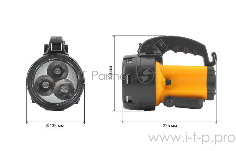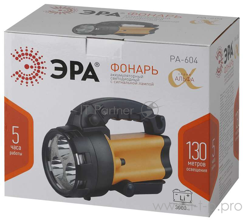 ЭРА Б0031035 Фонарь-прожектор PA-604 АЛЬФА {3 светодиода 1Вт, аккумулятор 4В 4,5Ач, два режима яркости, сигн. красный фонарь, ЗУ 220В+12В}
