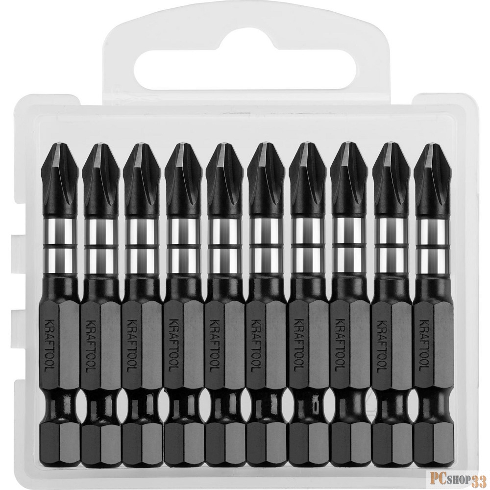 Биты KRAFTOOL Impact Pro, Philips, тип хвостовика E 1/4, PH2, 50мм, 10шт, в пластиковом боксе [26191-2-50-S10]