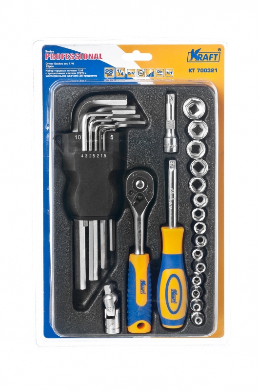 Набор головок торцевых и принадлежностей KRAFT 28 предметов (с имбусовыми ключами) [KT 700321]